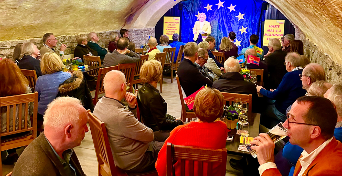 Friedrichsdorf, 15.02.2024: Beim Anblick des bis auf letzten Platz gefüllten Kellers konnte man fast glauben, der Ortsverbandsvorsitzende der Freien Demokraten Fabian Höhn meinte es ernst: „Die FDP ist auf dem Weg zur Volkspartei.“, hatte er die traditionelle Aschermittwochsveranstaltung der Liberalen eingeleitet und damit für beste Stimmung gesorgt. Fast 60 Gäste hatten sich in Garniers Keller eingefunden, darunter auch Claudia Schlick und Katja Gehrmann, die Friedrichsdorfer Fraktionsvorsitzenden von FWG und CDU.