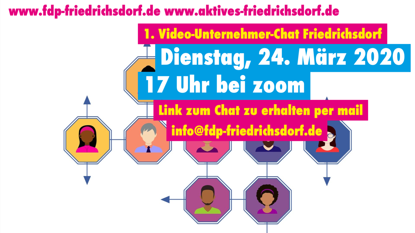 Die FDP Friedrichsdorf hat die Initiative ergriffen und Kontakt zum Verein Aktives Friedrichsdorf e. V. aufgenommen, um einen Austausch zur aktuellen Situation zwischen Unternehmern, Gewerbeverein, Stadt und Politik anzuregen. In Zeiten, in denen soziale Kontakte auf ein Minimum reduziert werden sollen, bietet sich die Digitalisierung hervorragend an, um trotzdem und sicher in Kontakt zu treten und zu bleiben. Wir möchten Sie in Kooperation mit Aktives Friedrichsdorf e. V. herzlich einladen zum „Video-Unternehmer-Chat Friedrichsdorf“