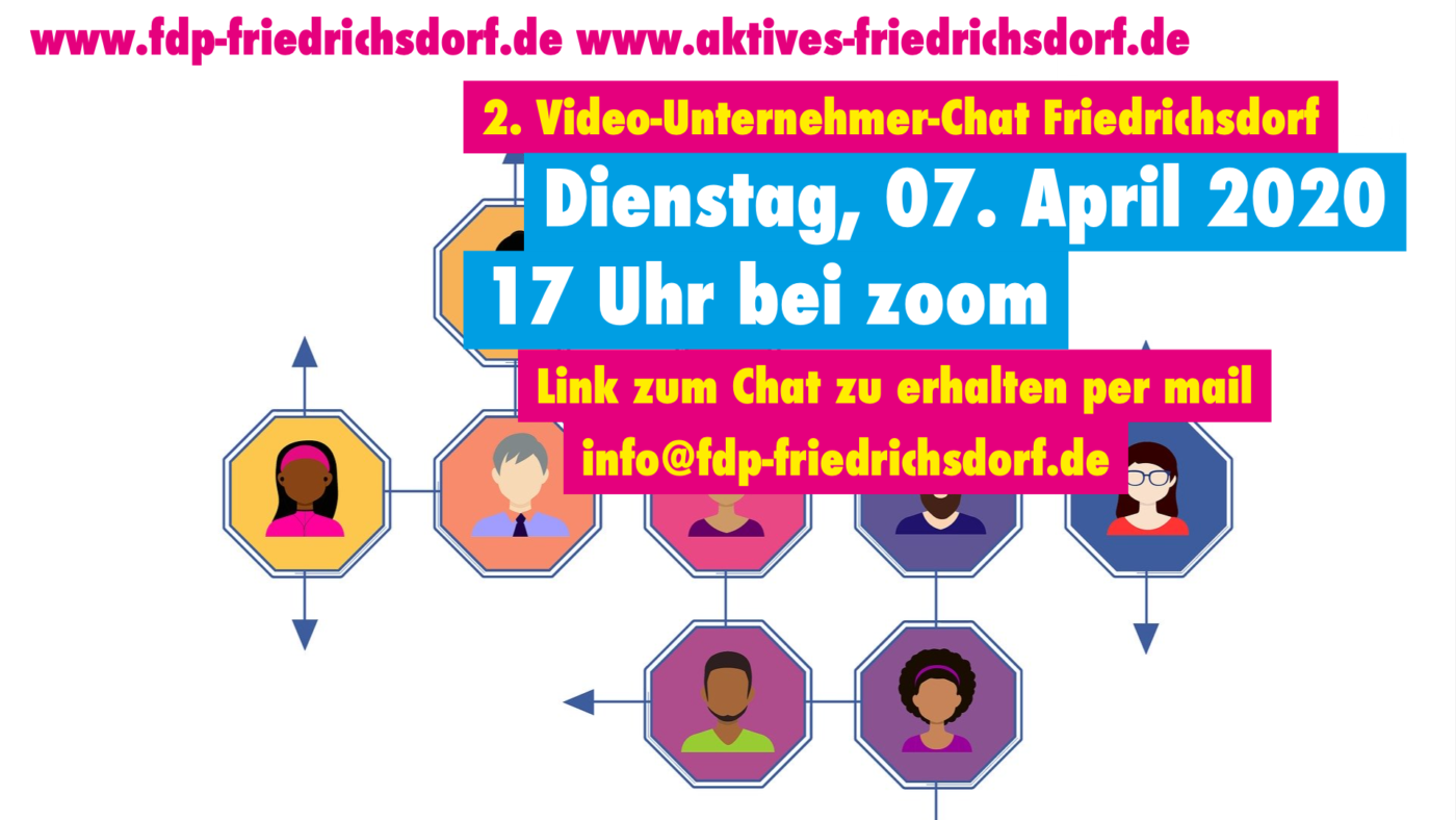 Die FDP Friedrichsdorf stellt den Video-Chat über die digitale Plattform Zoom zur Verfügung. Datenschutz ist gewährleistet; es findet natürlich keine Aufzeichnung oder Veröffentlichung des Video-Chats statt. Die Chat-Inhalte werden selbstverständlich von allen vertraulich behandelt.